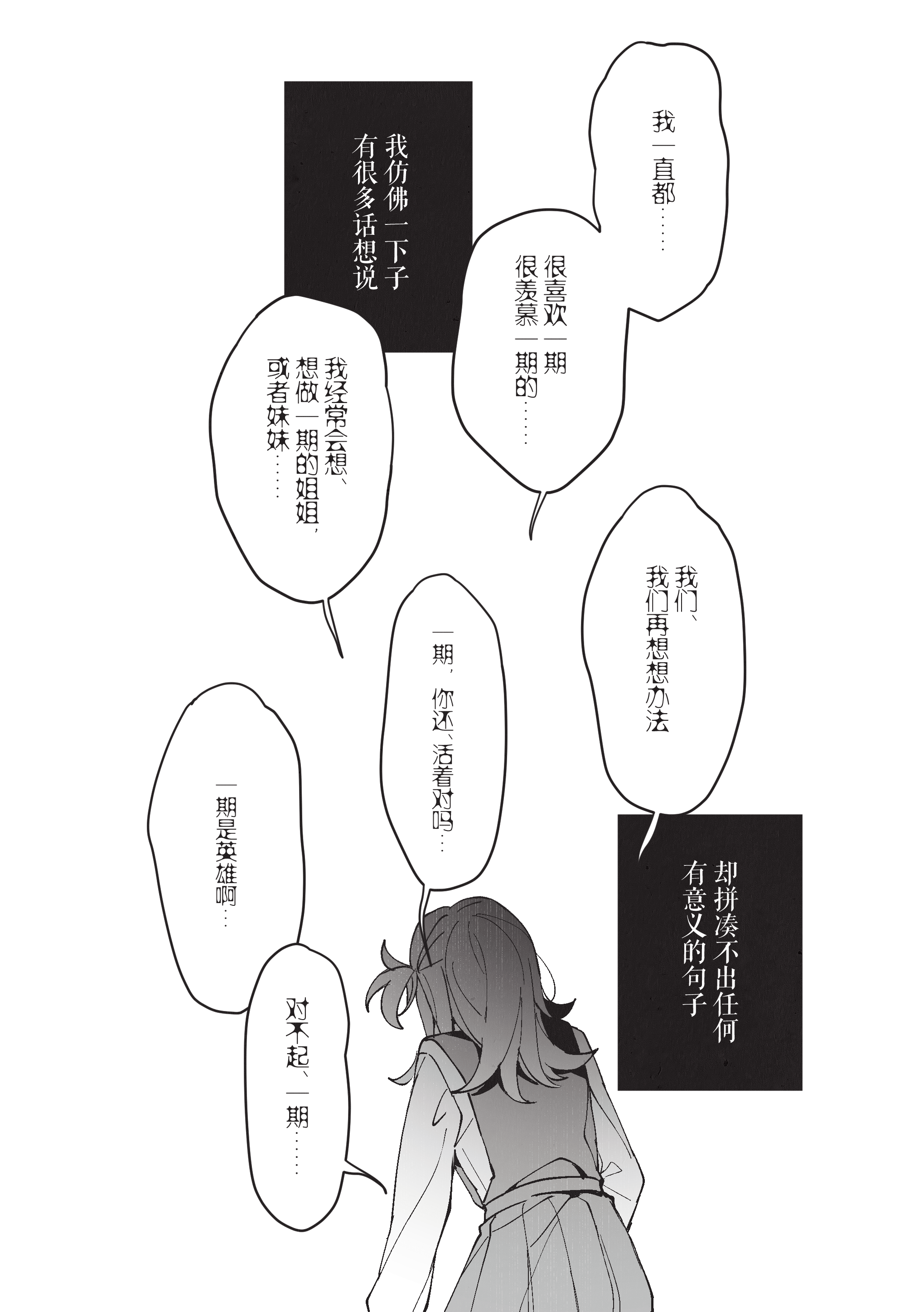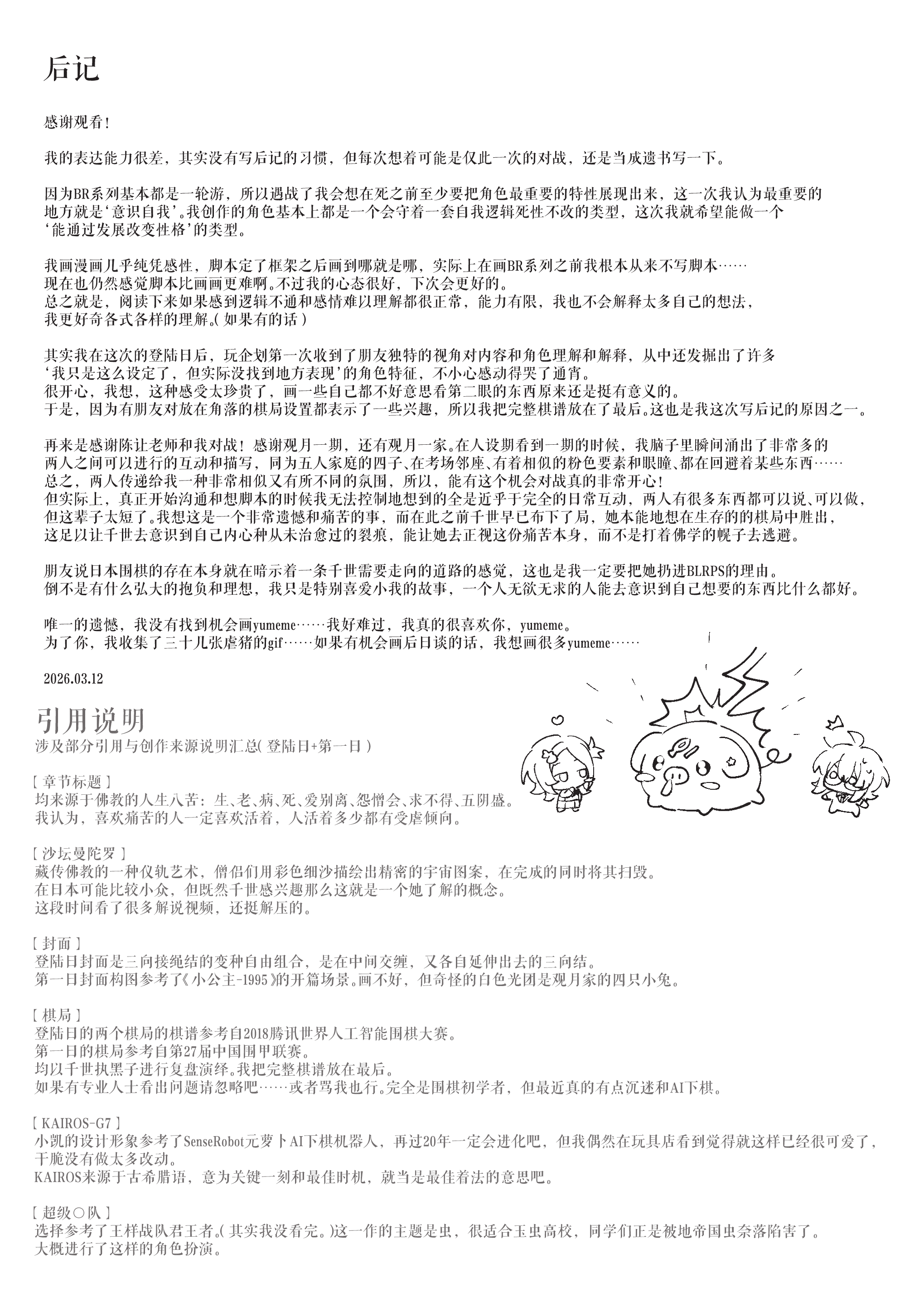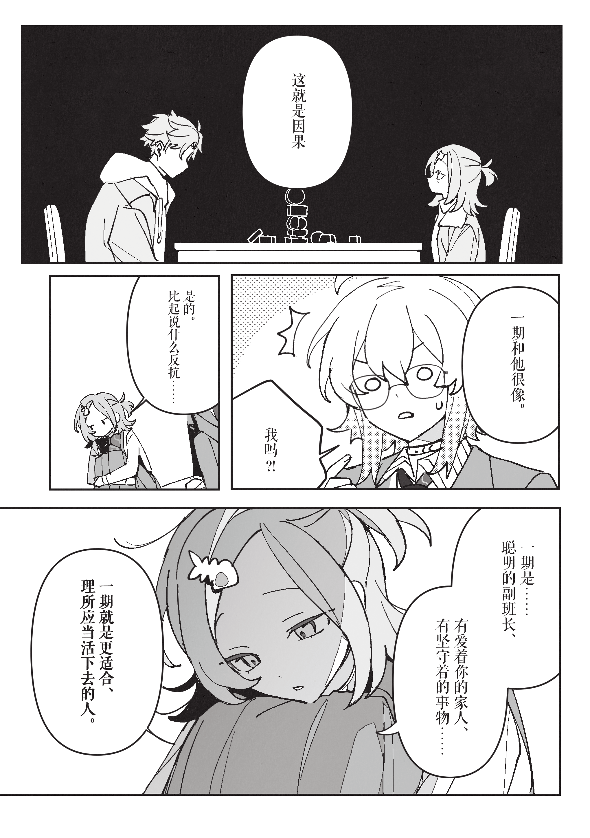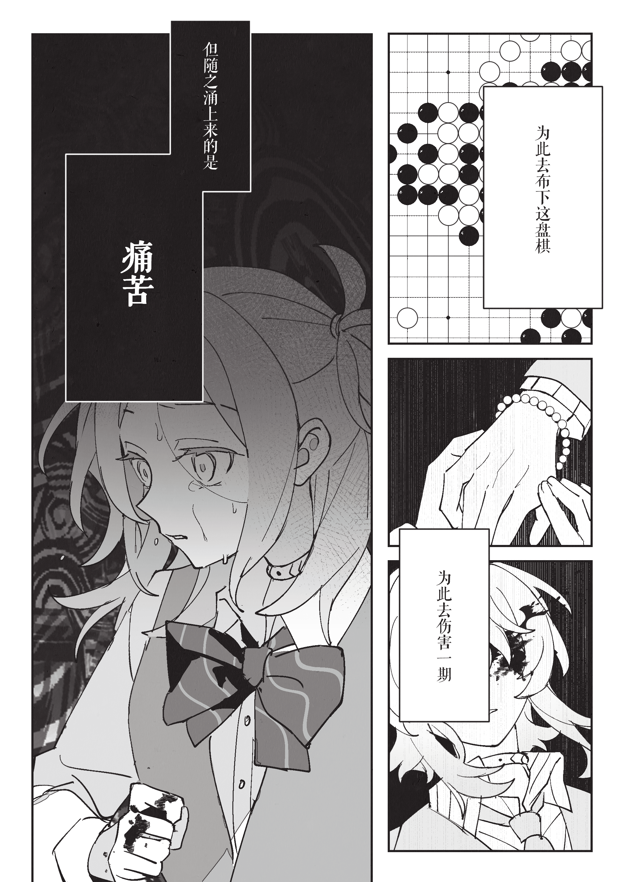 从一开始觉得自己看淡生死,到和一期共享珍稀的日常超人时间,再到时限接近终于紧逼一期很有前面慢慢部署、给一期机会杀自己的感觉。到最后一口气击杀也很有种黑中盘胜感(不熟围棋单纯从最后的三个棋盘感觉)淡人攻击真人后开始反应到杀人的感觉甚至开始觉得愉悦这真是啊啊啊啊 谢谢哈姆大人,要看更多围棋和佛禅联系(不熟佛教,但莫名联想这样杀下去不知道千世会不会算走上修罗道?)