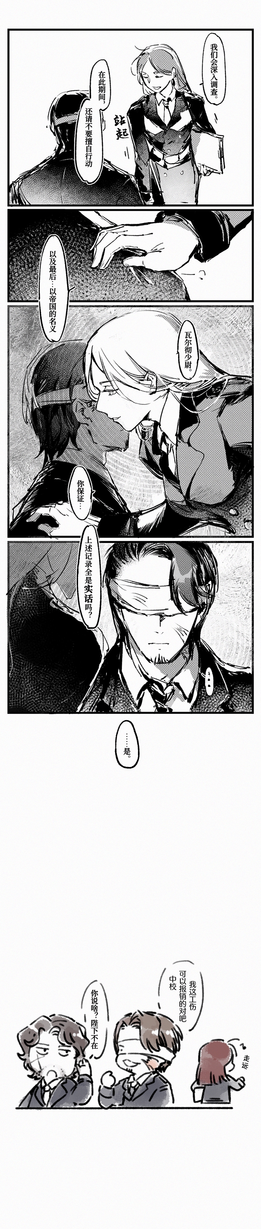食用公主计划大失败!刀叉之下惶恐的女子眼神刻画得太好了,谈不上是职责还是私仇,好复杂的心情瓦尔彻少尉~不过能活着回来真是太好了。(瞎子说话聋子听怎么不算一种幽默)