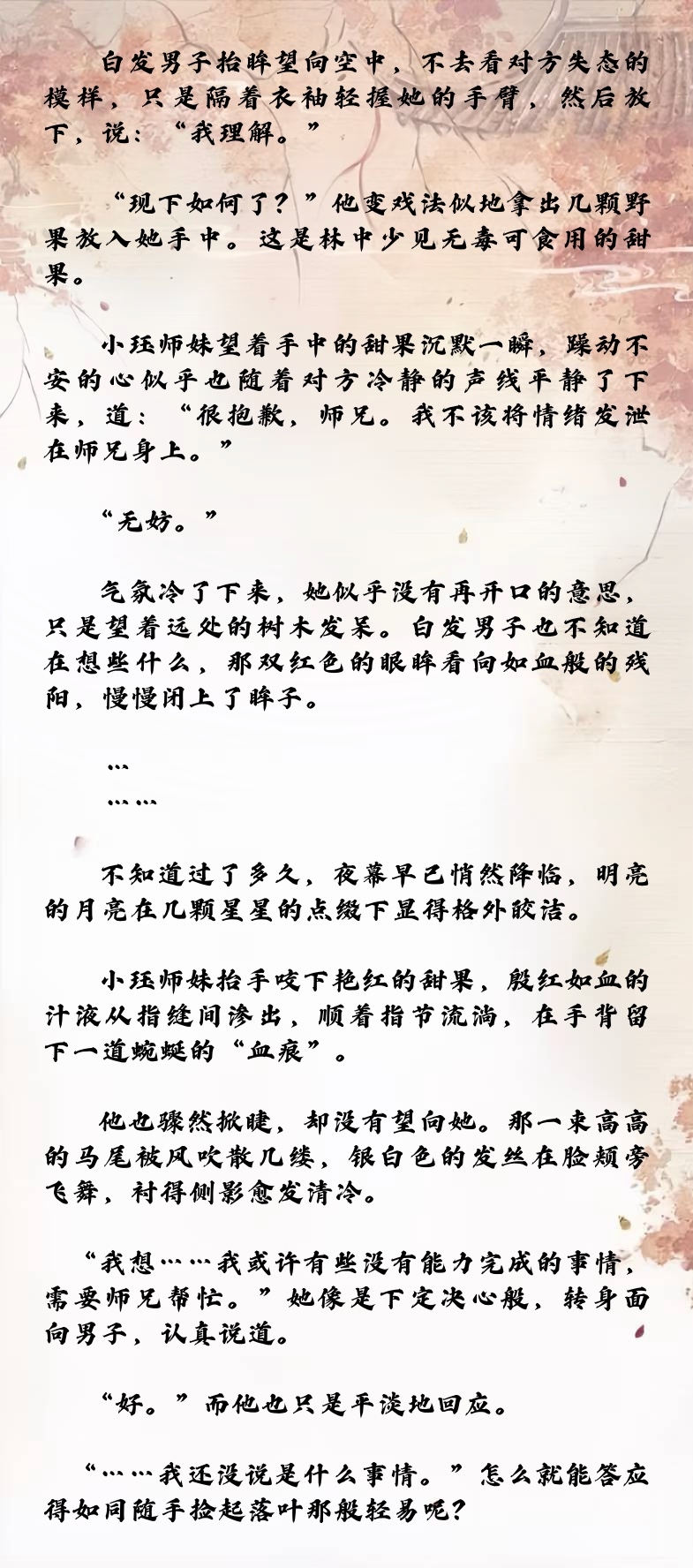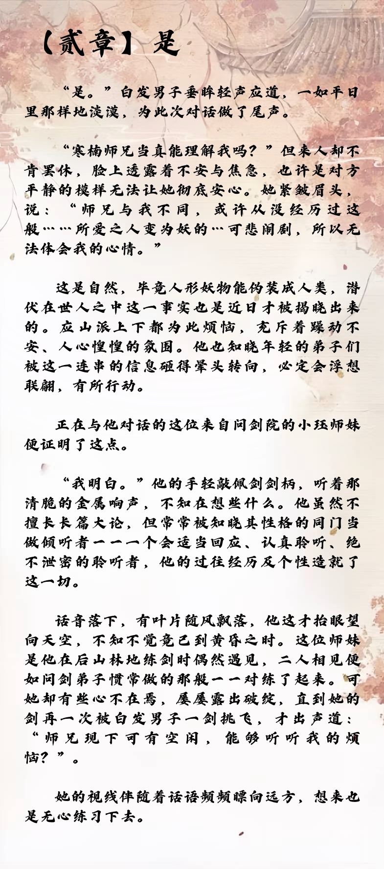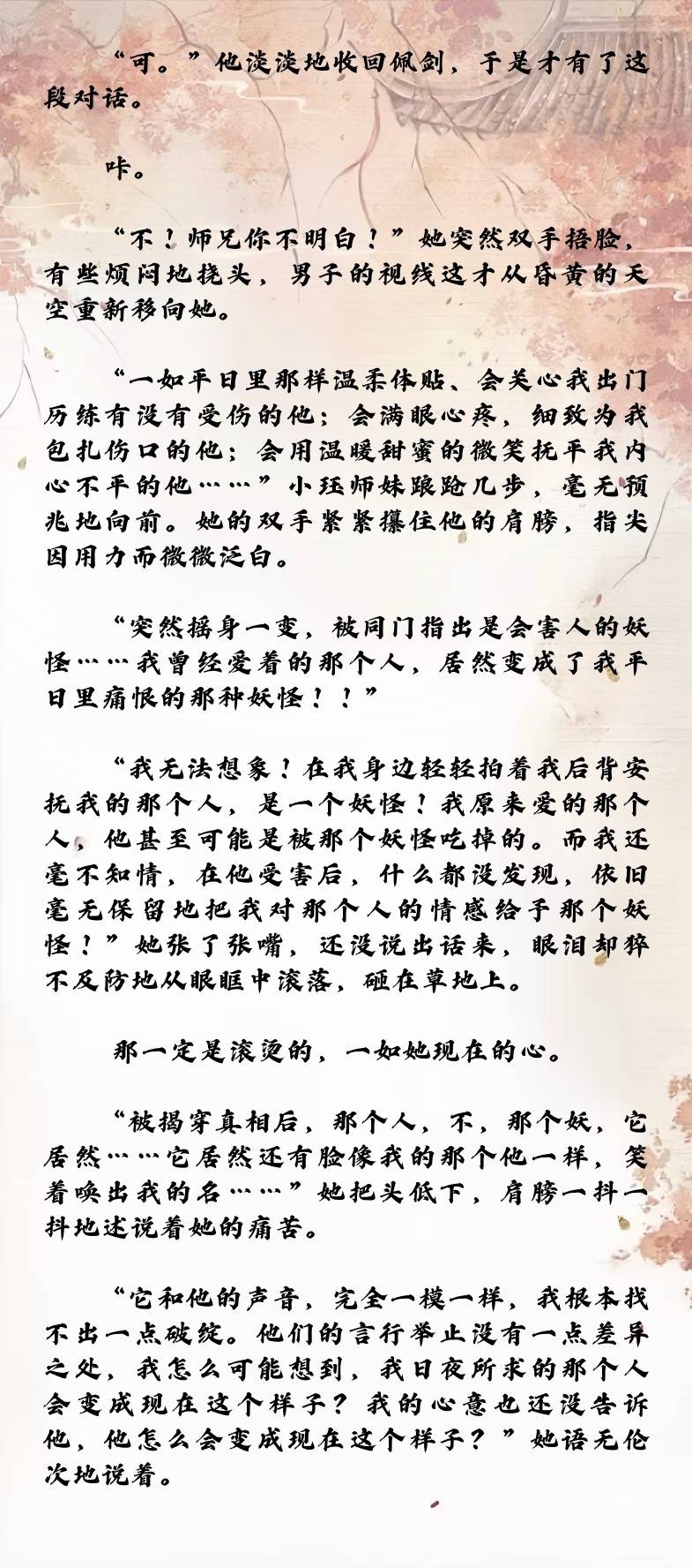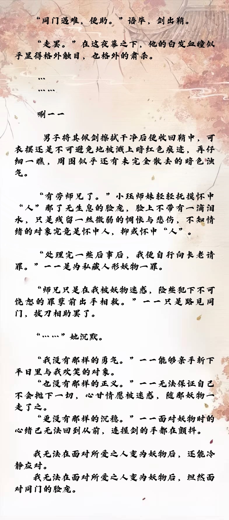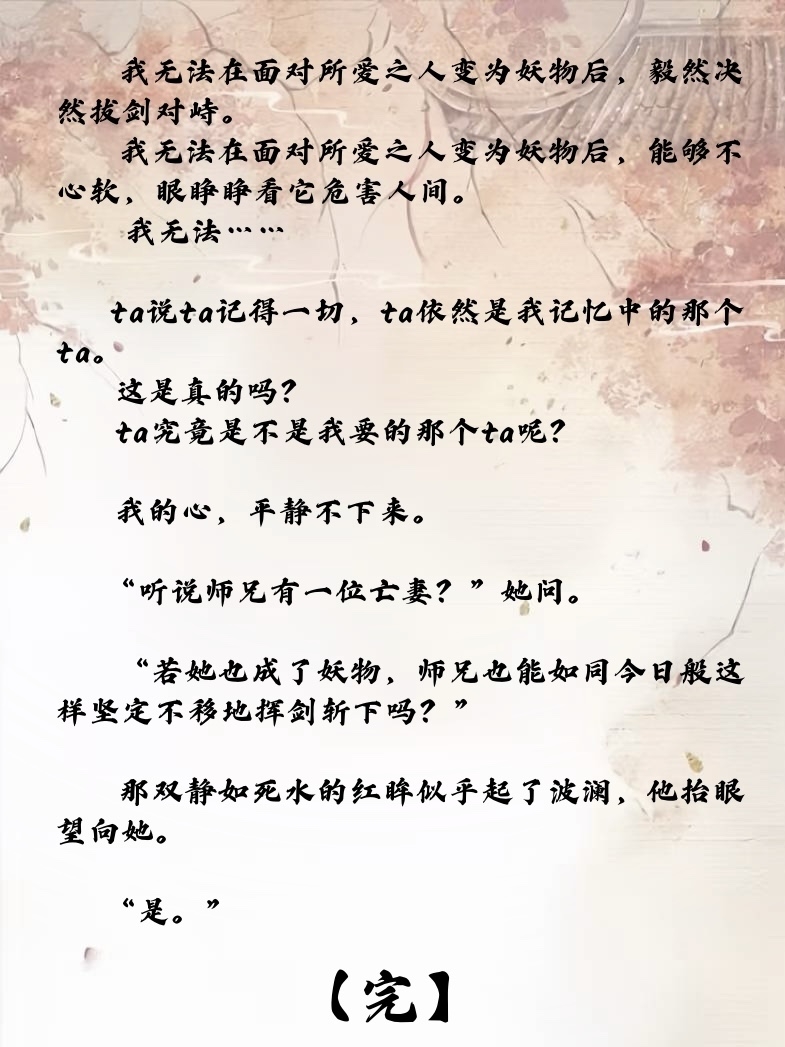 寒楠师兄居然是坚定派,不过从上一章已经可见一斑了,妻子是妖物杀的,现在又变成了妖……我命苦的师兄TT