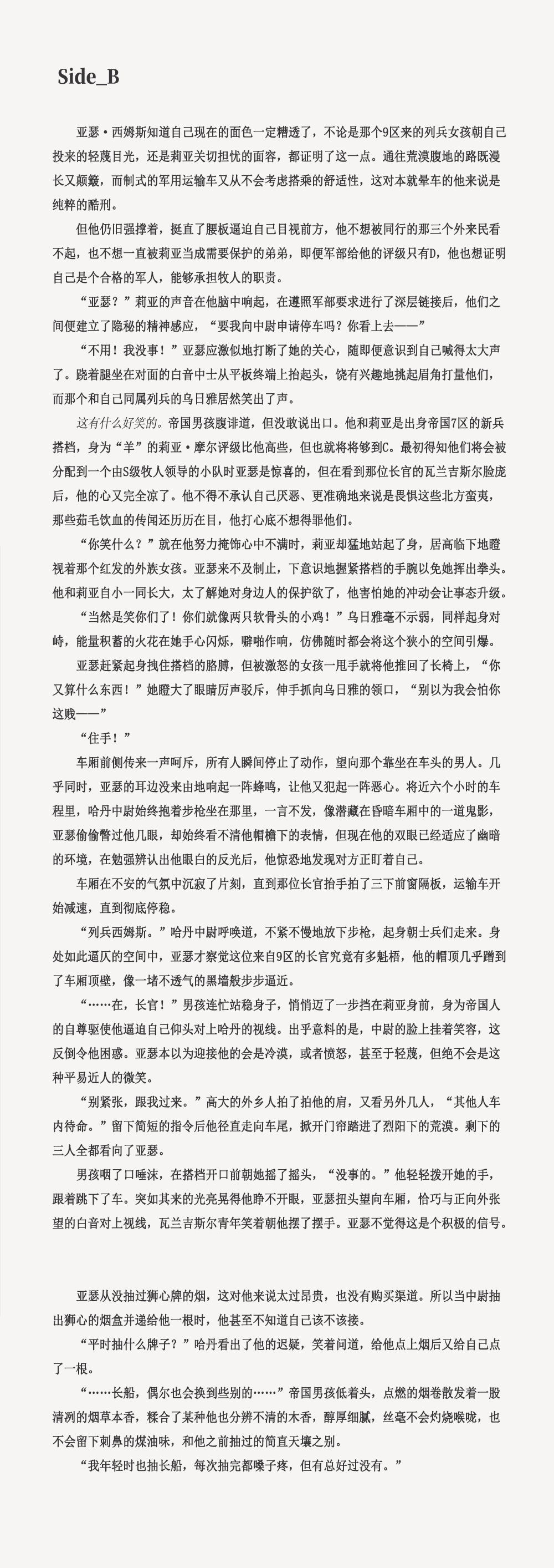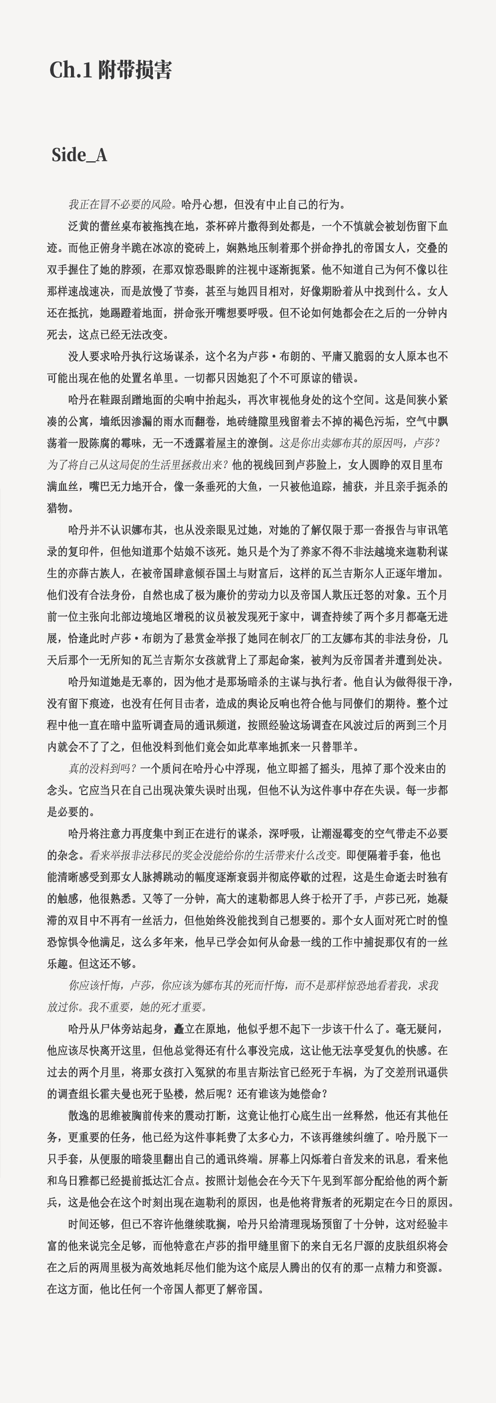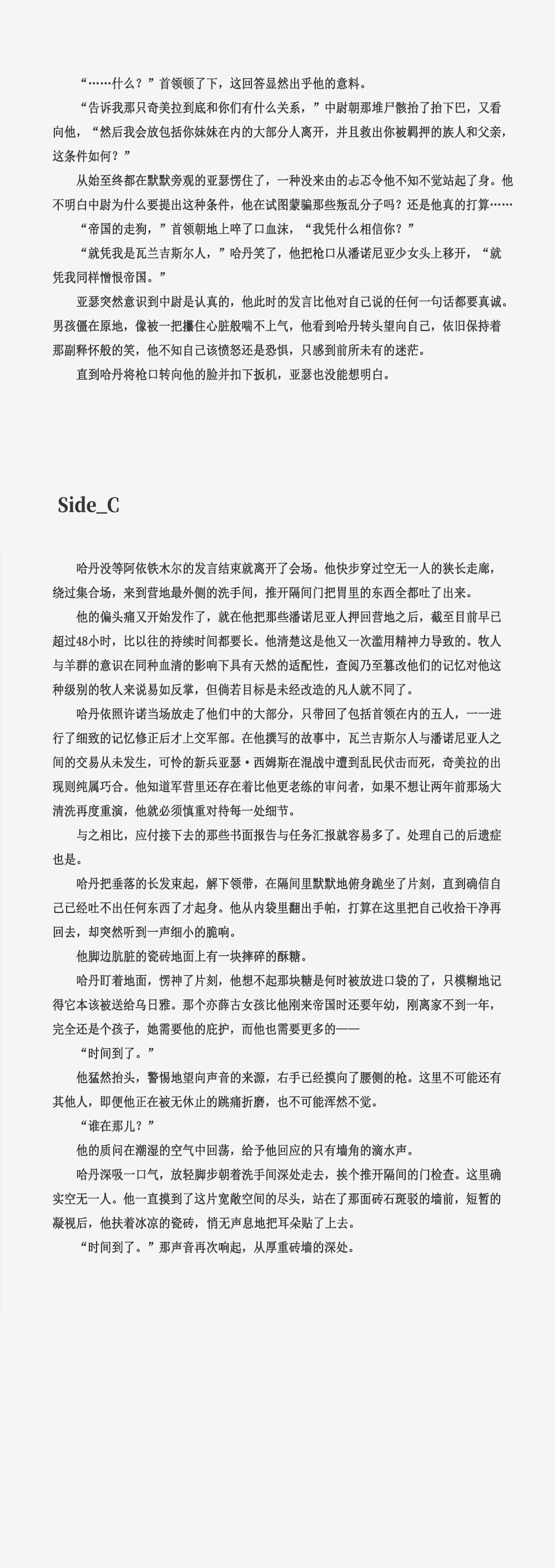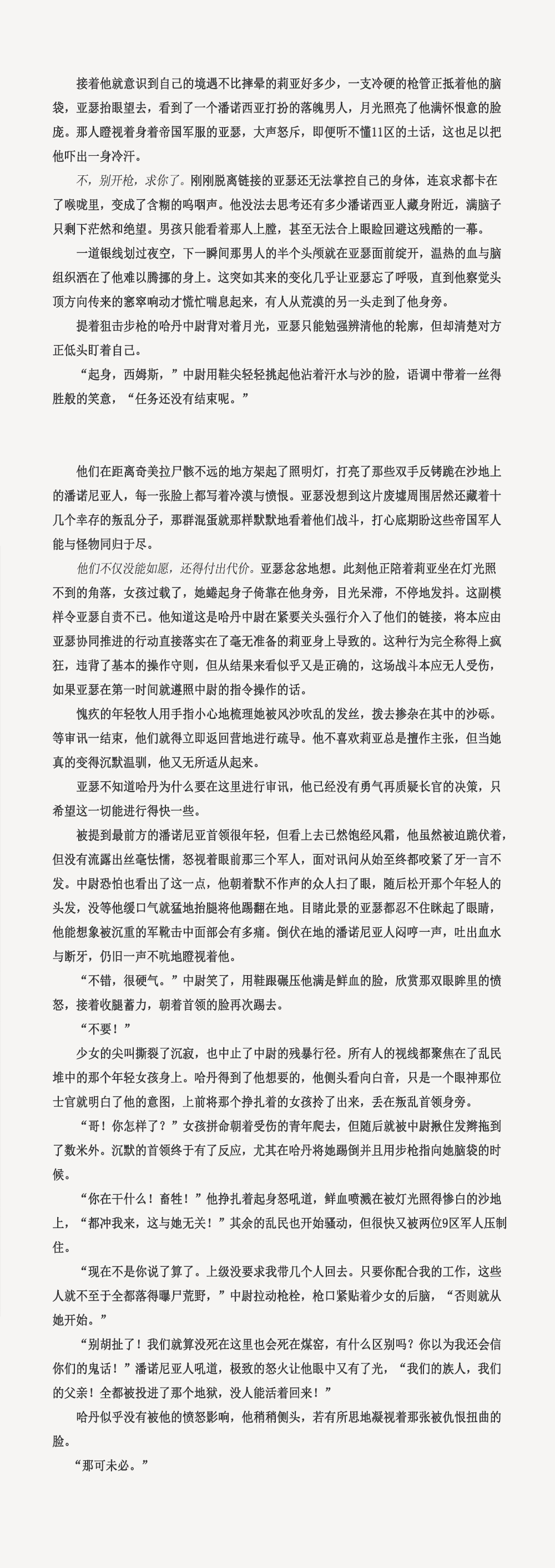 我天……好细腻的剧情描写和人物刻画,前半段剧情已经完全代入年轻的帝国士兵亚瑟的视角,完全没想到最后的结局是来自长官的冰冷枪口!一时间也分不清善与恶的分界线了,中尉……说过的那些话里只有最后那一句是实话吗?
