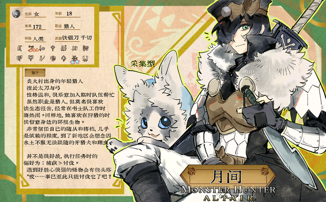 来自炎火村的年轻猎人 擅长太刀与弓 很乐意加入临时组建的队伍帮忙 莫名很喜欢读书士队的生态报告,也会讲一些家乡的怪谈故事