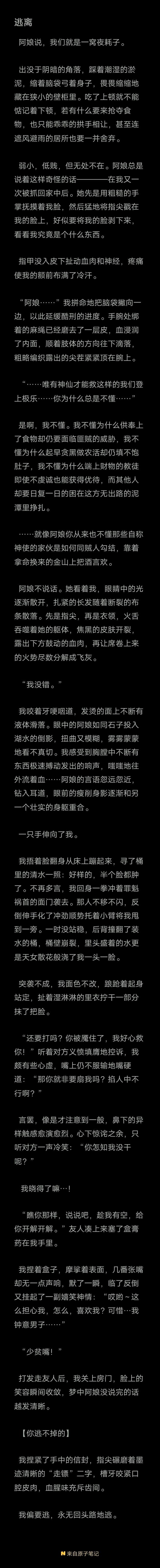 老大写得特别好!我真的很喜欢这样的设定,请莫汪带着信念一直“逃”下去吧!(可以这么称呼OC吗?突然发现“莫汪”好像是谐音“莫忘”诶)