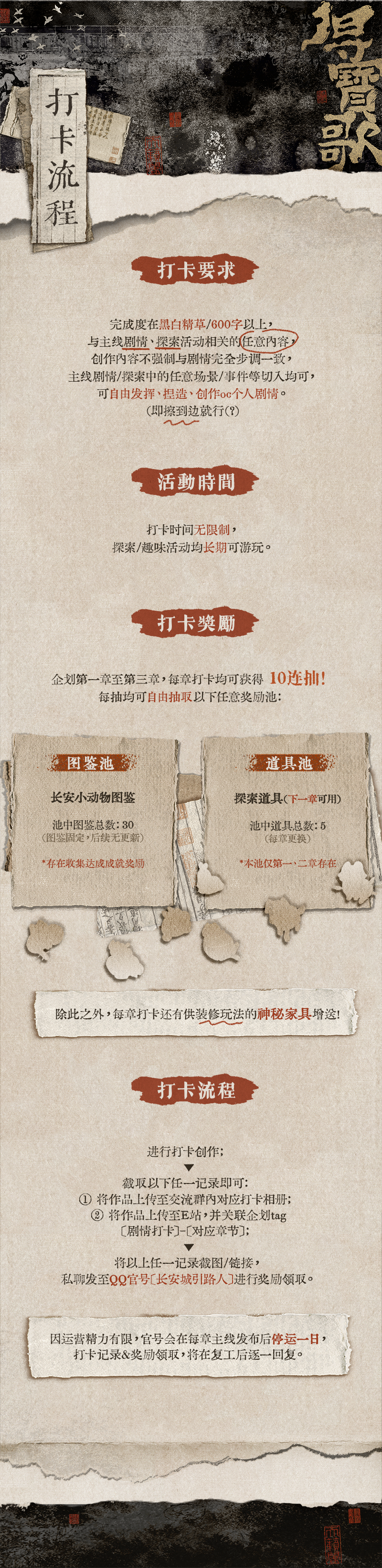 • 主线打卡可自由上传群相册或E站,将打卡的截图或链接记录私聊发送给QQ官号【长安城引路人】进行奖励领取;
