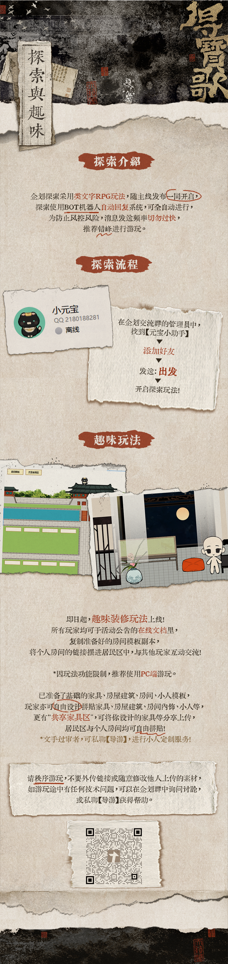 • 本章探索玩法已开启,请添加企划群群管理中的【元宝小助手】为好友后,发送“出发”进行游玩;