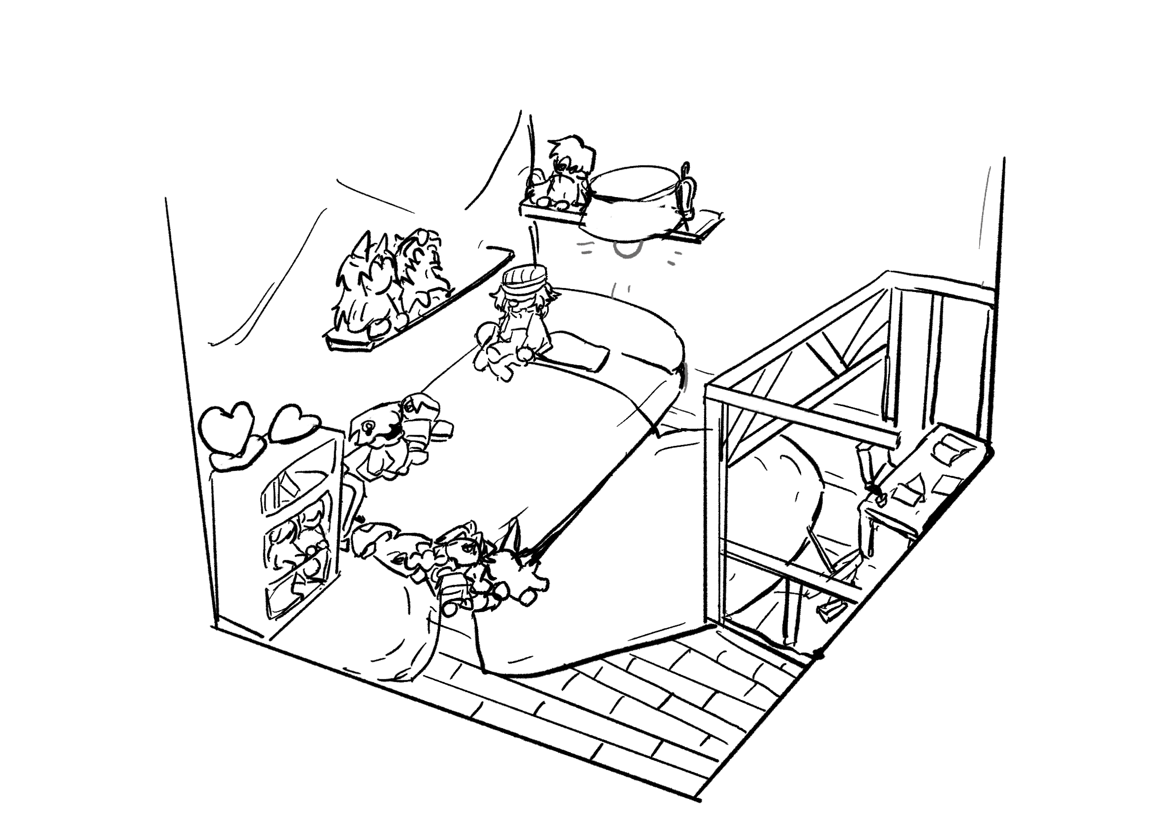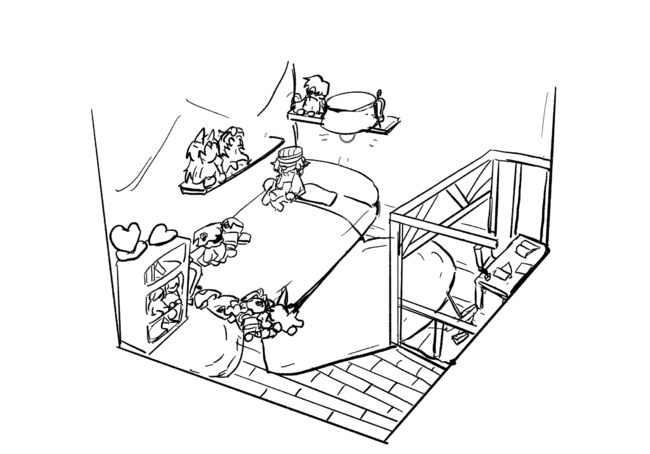 左侧的墙面靠着一个书架,上面摆满了从玩偶室拿到的娃娃。书架的另一边挨着床,床上也摆满了娃娃,地上还散落了一些。