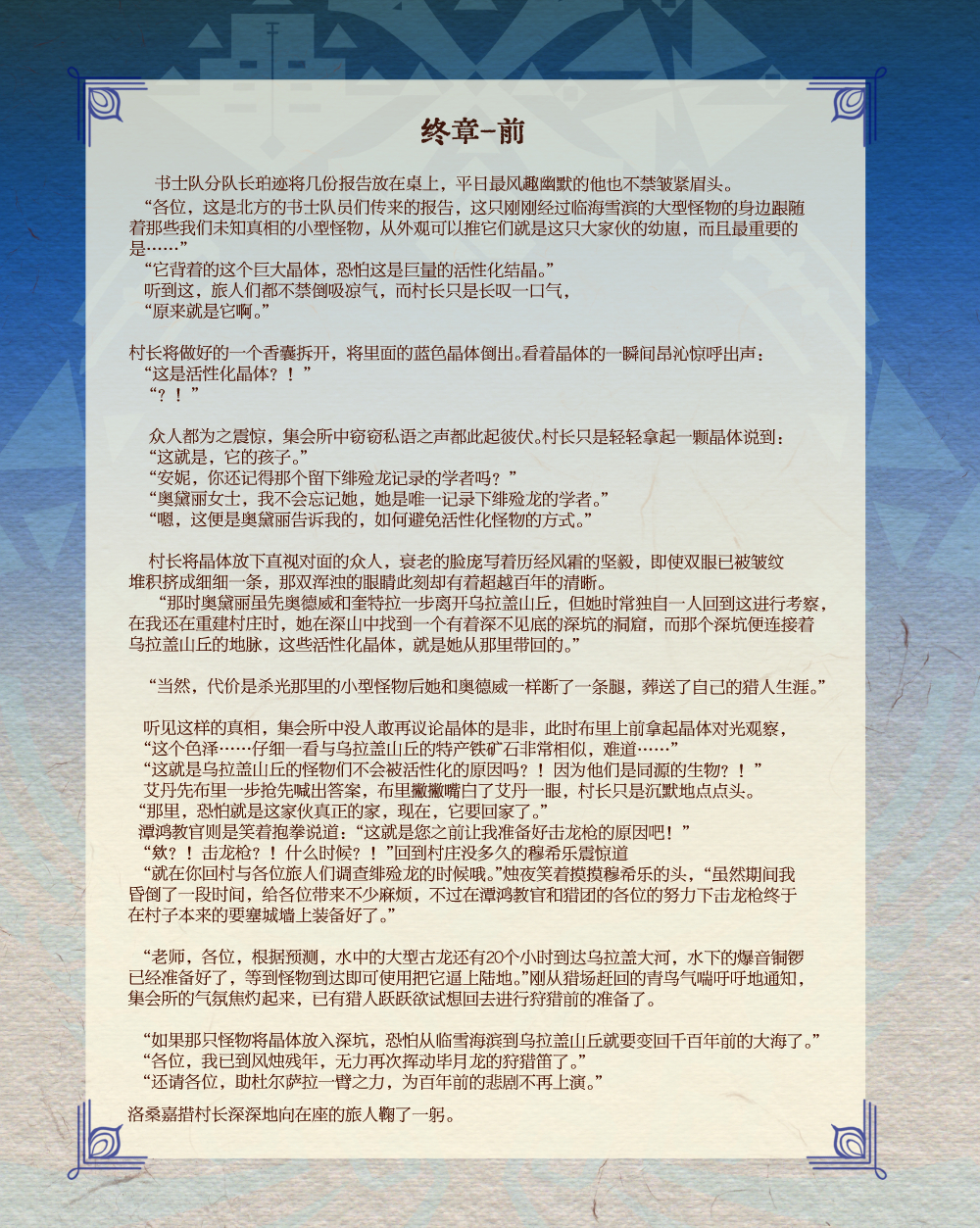 终章解禁怪已更新。 感谢各位的耐心等待,对企划组的包容,感谢各位在过去一年的支持,终章创作与后日谈可随时创作上传。 终章更新原创怪物: 灿壑龙 终章主线任务总结 村任务9★同道各努力,千里自同风