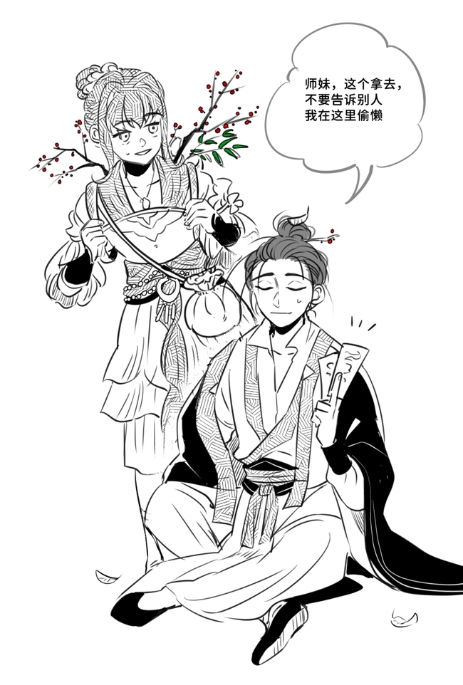 师兄要是完成了工作的话,那偷懒一下也不是不行……!感谢师兄的符嘿嘿(头上的簪子是折了一簇荚蒾背篓里的果枝吗ww萌!)