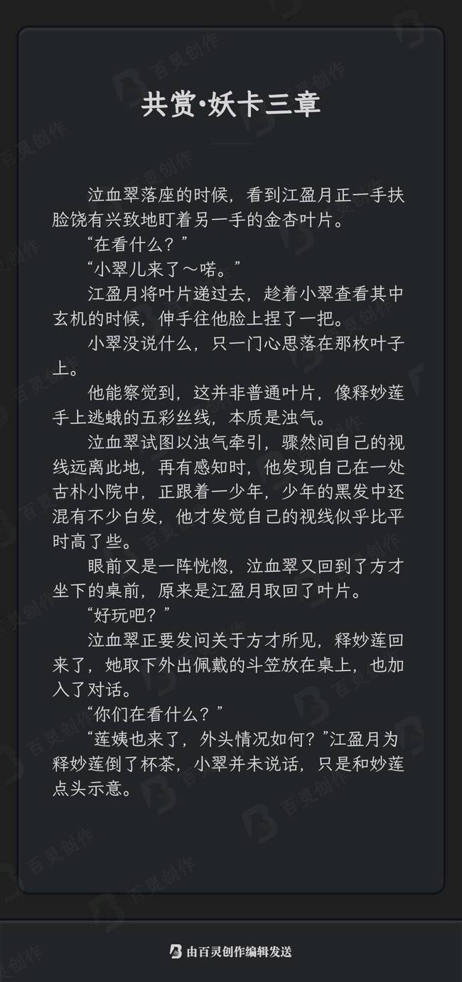时间线依旧是重建后 ,响应角色补全后再加 关于叶片: 是妖卡的能力,江盈月偷偷留了一片银杏叶在方少游身上,浊气不多难以察觉,两人就是通过这个得以转换到少游视角 一个把两张卡(实际不止两张)串起来的小巧思(。・ω・。)ノ♡