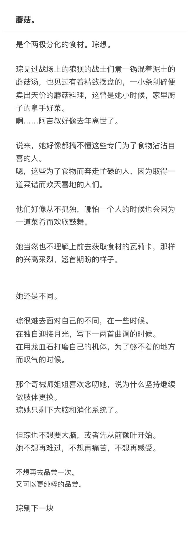是那种淡淡的、清爽的文字呢w究竟是切蘑菇还是切脑子也是一种奇妙的迷思