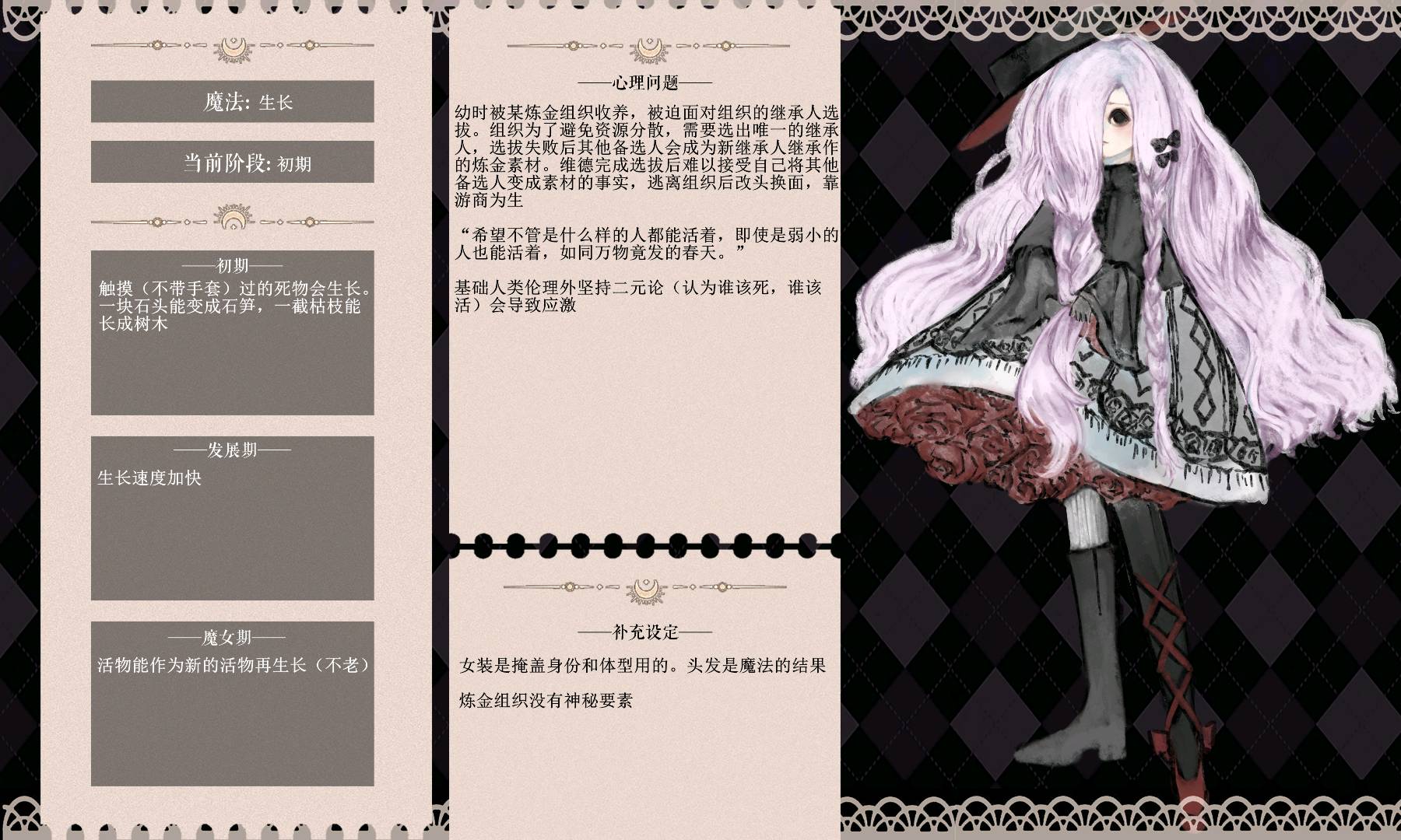 补全了最后一点故事和后日谈,还有一点设定杂谈 摸了一点 p2新立绘 p3魔女化 p4魔女化后背(背负金矿.jpg) p5三阶段 p6四阶段 p7游商。工装裙 p8幼年。手里是会不断生长的煤炭 p9留级生。身体的问题没了,让孩子穿会儿裤子吧 p10里卡(仅供参考,此人极爱吃书) 说来常常会在群里发言时玩梗,虽然也有点怕没人get到,主要还是害怕冒犯到大家,但又忍不住…没被骂真是太好了(溜走)
